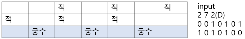 - N + 1 줄에는 캐슬이 있습니다. 이 캐슬을 지키기 위해서 3명의 궁수를 배치합니다.