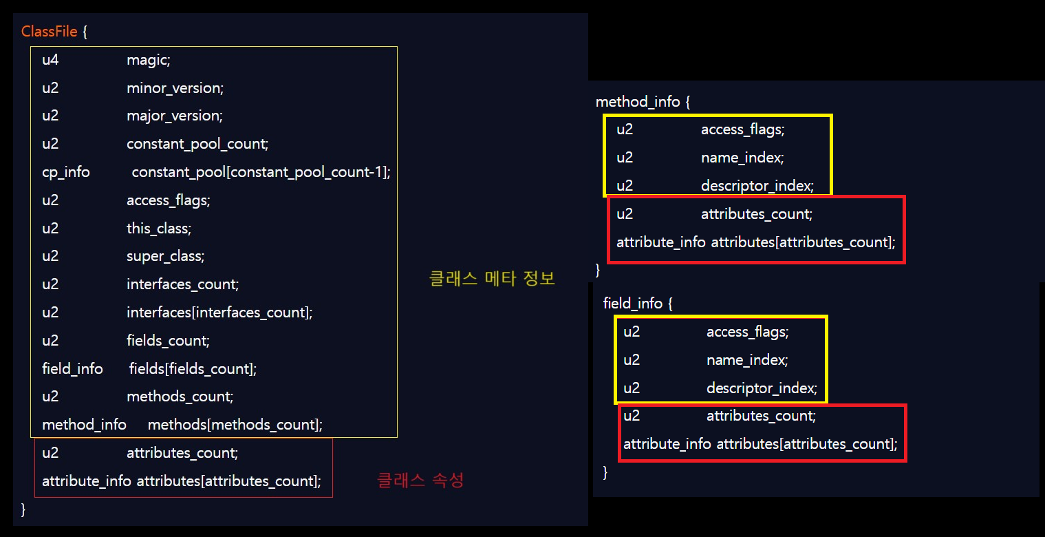 클래스파일은 메타 정보와 속성으로 구성됩니다. 속성은 final, Exceptions, SourceFile, Generics, Code 과 같은 정보를 나타내며 클래스를 풍부하게 하는 역할입니다. 이러한 속성은 클래스를 대상으로 작성하면 class_file에 존재하며 필드 변수를 대상으로 작성하면 field_info에 존재합니다. 그리고 메서드를 대상으로 작성하면 method_info에 존재합니다.