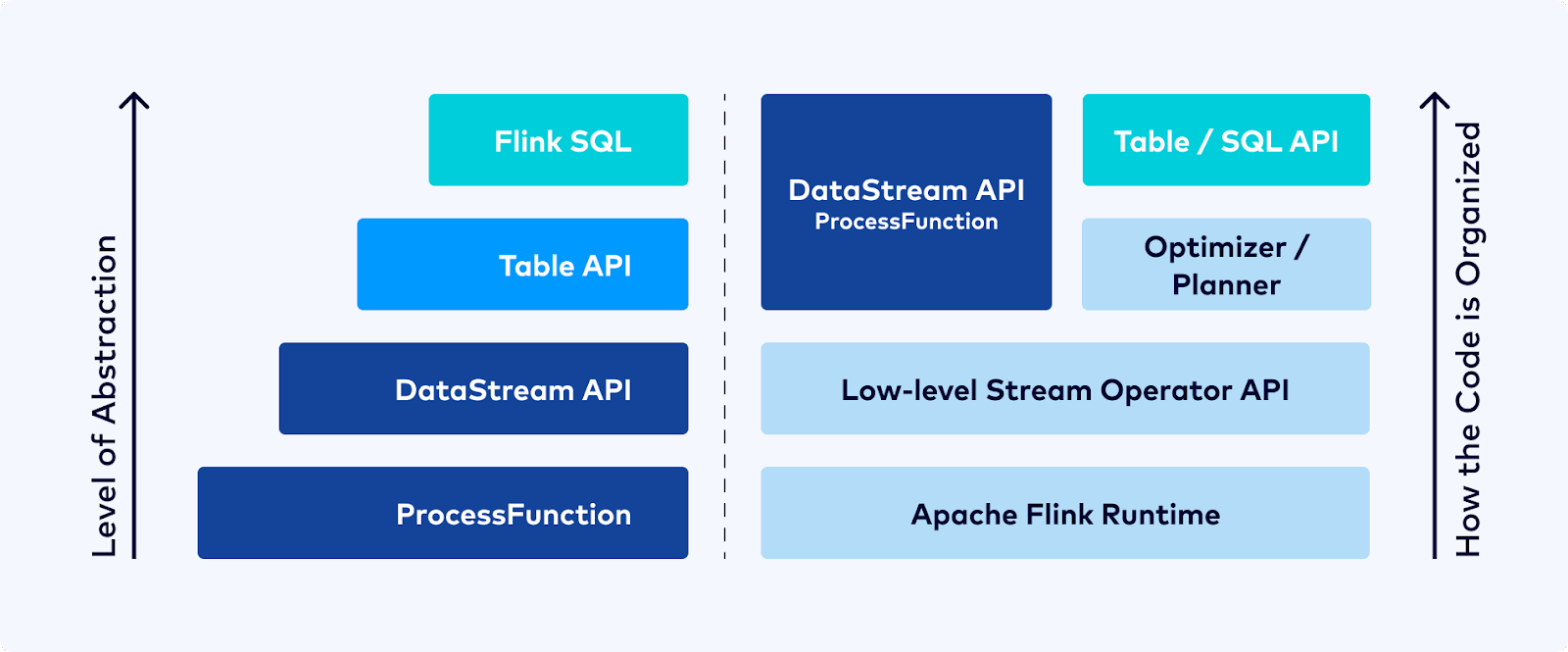 Flink는 이미지와 같이 다양한 계층의 API를 제공하여 데이터를 효율적으로 처리할 수 있도록 합니다.ProcessFunction 을 통해서 타이머, 상태관리를 조작하는 등의 Flink에서 저수준의 프로그래밍을 지원합니다.DataStream API는 저수준의 프로그래밍 API를 제공하여Multi Source / Multi Sink, BroadCasting, CheckPoint 등을 조작하는 등 복잡한 데이터 처리 로직을 구현할 수 있습니다.